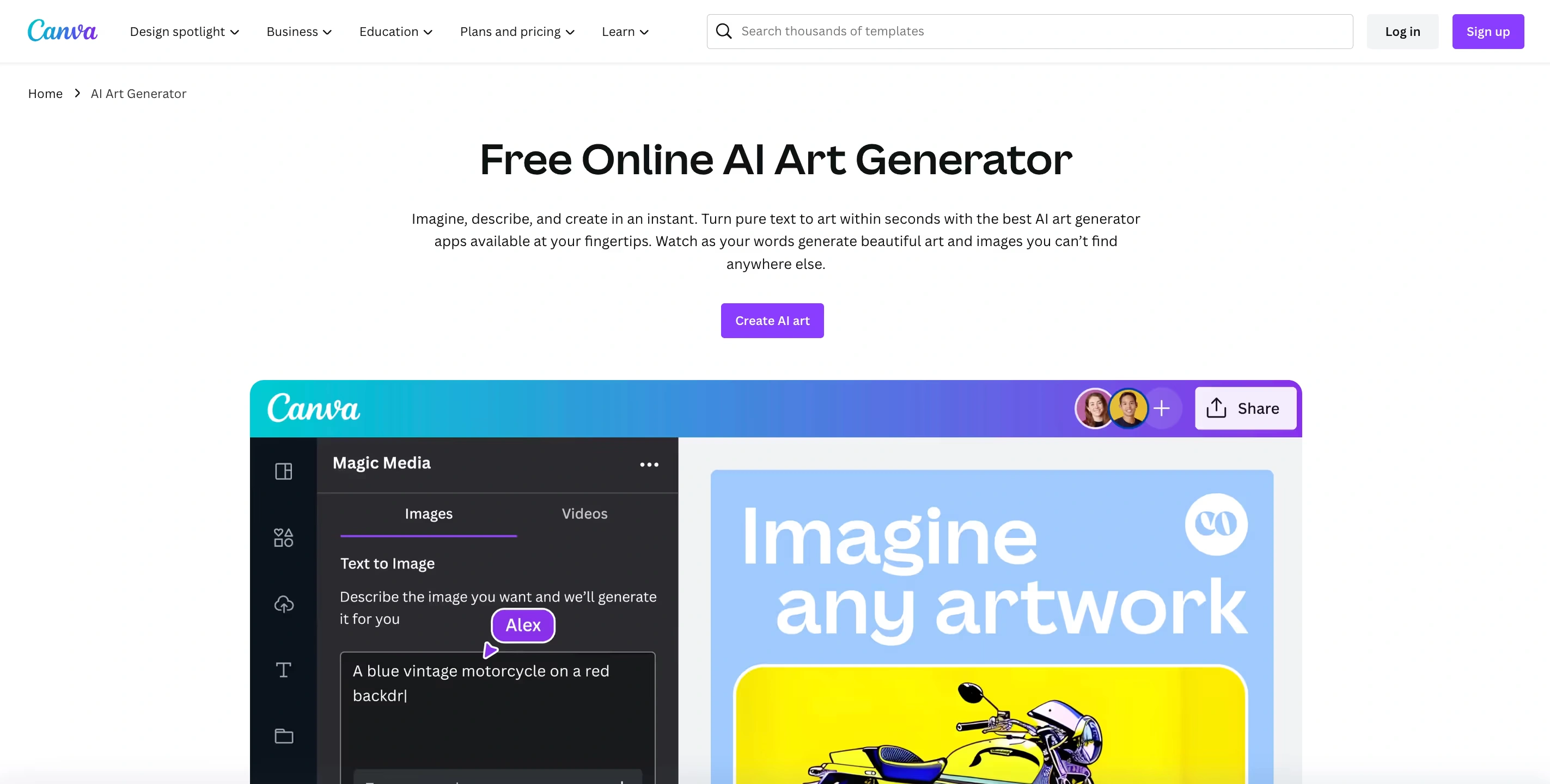 یکی از جدیدترین ابزارهای رایگان هوش مصنوعی Canva میباشد و میتواند به تیمهای مارکتینگ و طراحان کمک زیادی در تولید تصاویر هنری کند. هوش مصنوعی کانوا به شما اجازه میدهد فقط با وارد کردن متن در عرض چند ثانیه تصاویر هنری فوق العاده زیبایی خلق کنید و در شبکههای اجتماعی و پلتفرمهای دیگر از آنها استفاده کنید. شما میتوانید ایدههایتان را کاملا توضیح دهید و فقط در عرض چند ثانیه تصویر مورد نظرتان را بسازید.