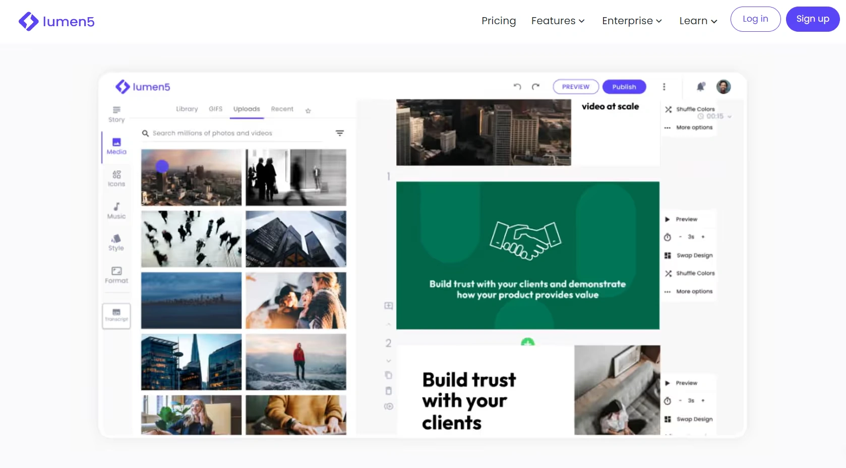 یکی دیگر از بهترین هوش مصنوعیهای رایگان برای تولید ویدیو Lumen5 است. این پلتفرم به خاطر محیط و ابزارهای کاربر پسند استفاده فوق العاده راحتی دارد. چه شما به دنبال تولید محتوا برای شبکه اجتماعی یا وب سایت تان باشید، میتوانید از قالبها و فرمتهای متنوع این پلتفرم استفاده کنید. نحوه عملکرد این پلتفرم به این صورت است که شما متن و اسکریپت مورد نظرتان را مینویسید و یک ویدیو با تصاویر مناسب خروجی میگیرید. این هوش مصنوعی با توجه به مجموعه گستردهای از تصاویر و ویدیوهایی که دارد، بهترین ابزار برای کسانی است که میخواهند خیلی سریع ویدیوهای جذاب و حرفهای بسازند.